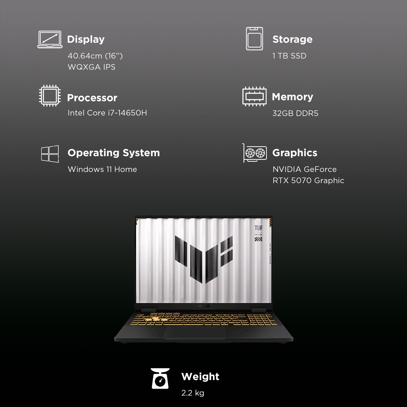 💻 ASUS TUF F16 FX688JPR-QT043WS Intel Core i7 14th Generation Gaming Laptop (32GB, 1TB SSD, Windows 11 Home, 8GB Graphics, 16 inch 165 Hz WQXGA IPS Display, NVIDIA GeForce RTX 5070, MS Ofice Home 2024, Jaeger Gray, 2.20 KG)