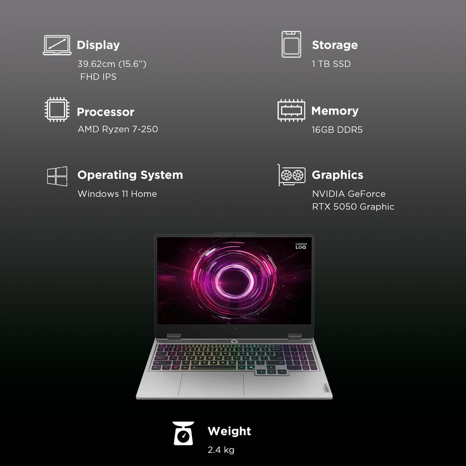 💻 Lenovo LOQ 15AHP10 AMD Ryzen 7 Gaming Laptop (16GB, 1TB SSD, Windows 11 Home, 8GB Graphics, 15.6 Inch 144 Hz Full HD IPS Display, NVIDIA GeForce RTX 5050, Luna Grey, 2.4 KG)
